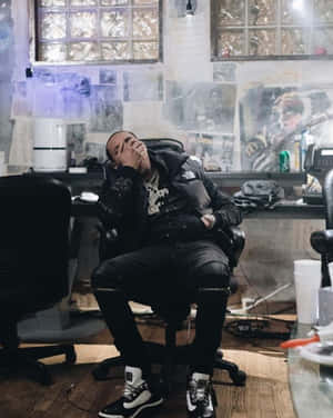 A Black Man Sitting On A Chair With A Black Background Wallpaper -