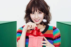 "hirai Momo Radiant In Red While Holding A Gift Box" Wallpaper -