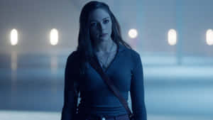 A Woman In A Blue Dress Sitting On A Chair Wallpaper -