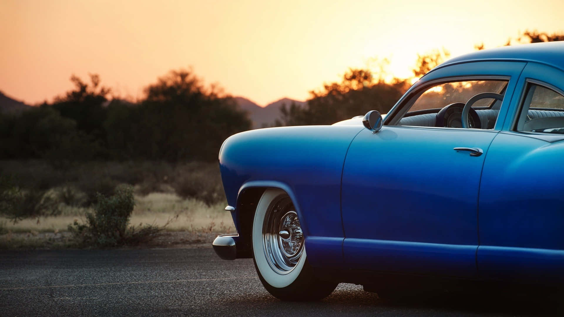A Beautiful Blue Car Parked In A Chic Neighborhood. Wallpaper