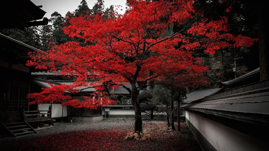 A House With Red Leaves And A Red Tree Wallpaper -