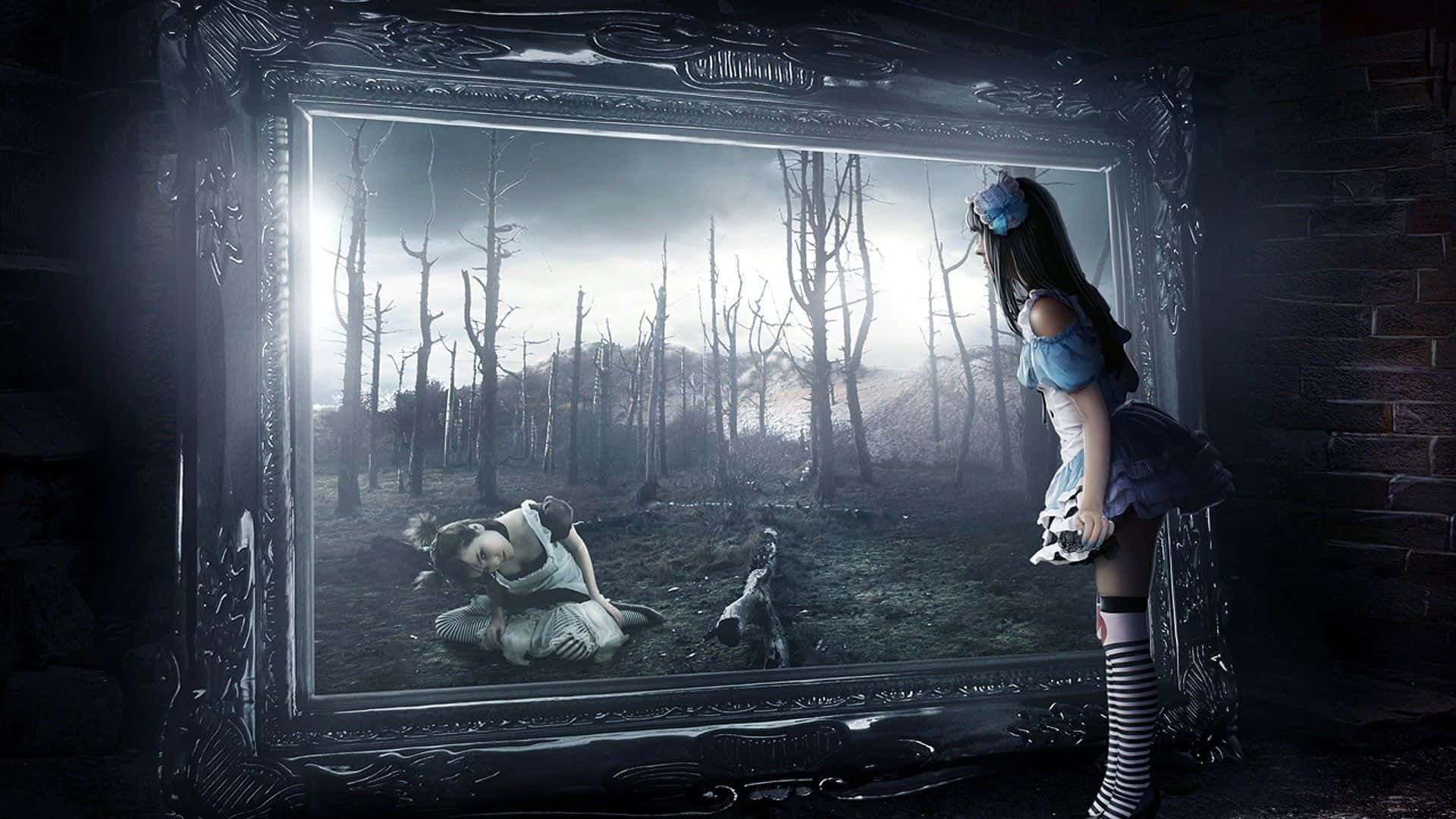 A Girl Is Looking At A Mirror In A Dark Room Wallpaper