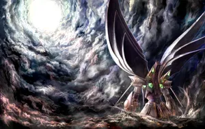 A Painting Of A Stormy Ocean With A Sun Shining On It Wallpaper -