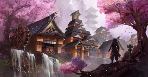 A Japanese Style Game With A Purple Sky And A Castle Wallpaper -