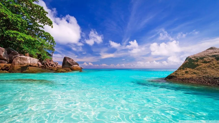 A Beach With Clear Water And Blue Sky Wallpaper -