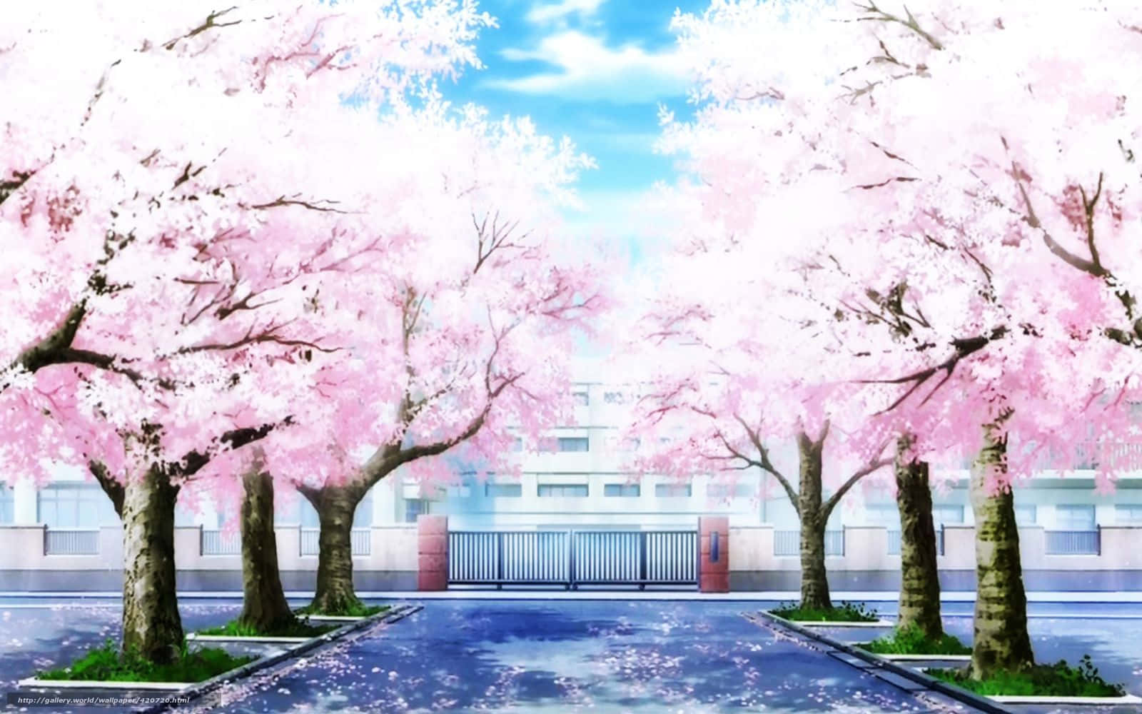 The Beauty Of Cherry Blossoms And Anime Combine In A Beautiful Landscape Wallpaper -