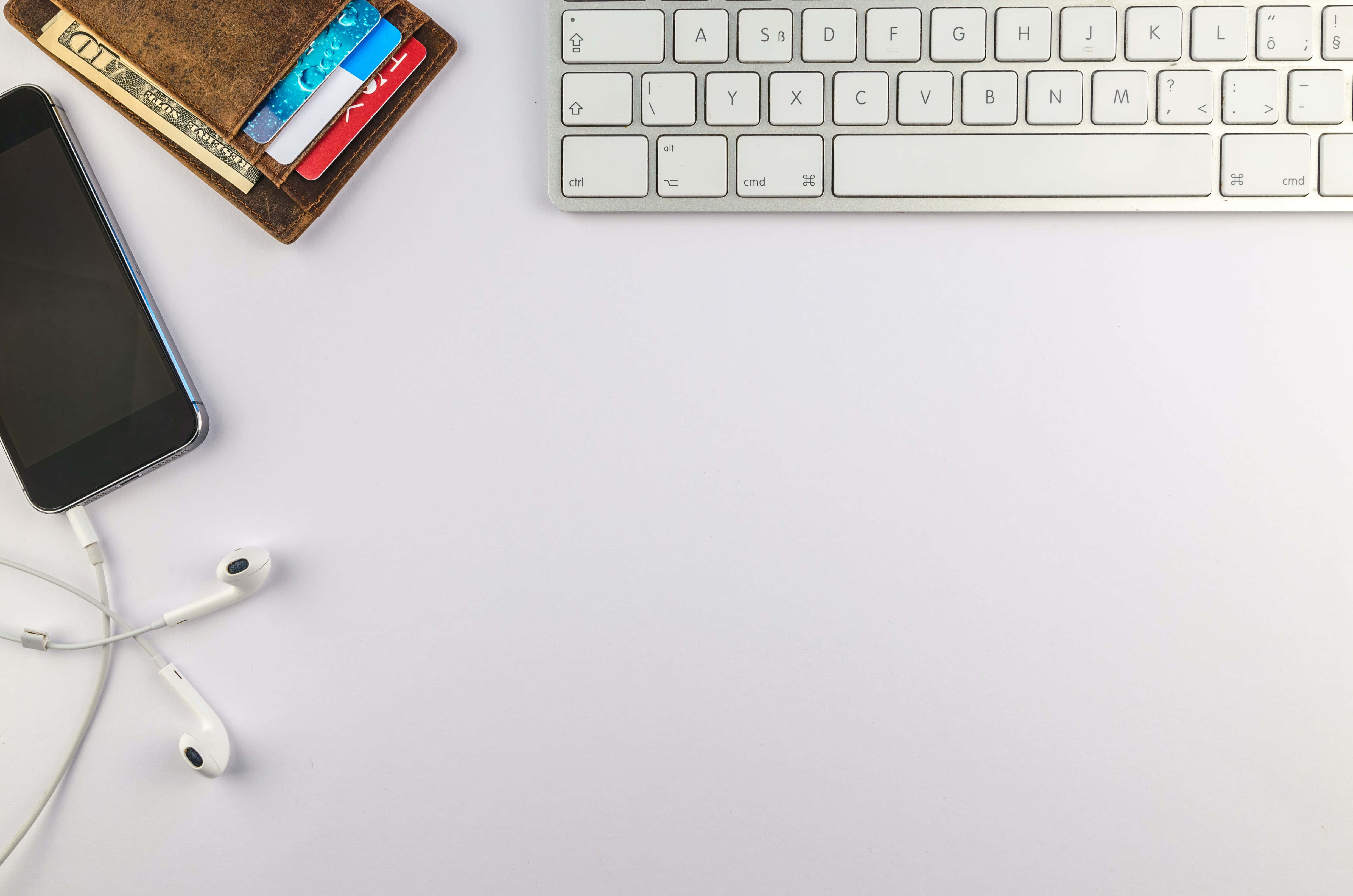 A White Desk With A Keyboard, Phone, And Headphones Wallpaper