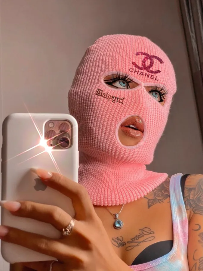 A Woman Wearing A Pink Knitted Mask Taking A Selfie -