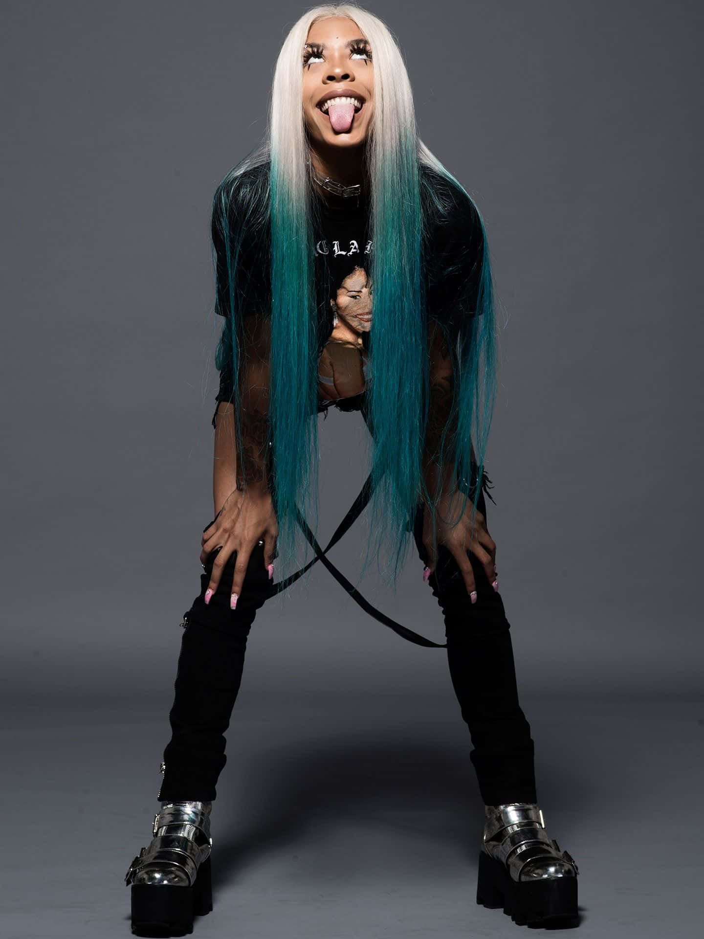 A Woman With Blue Hair Posing For A Photo Wallpaper