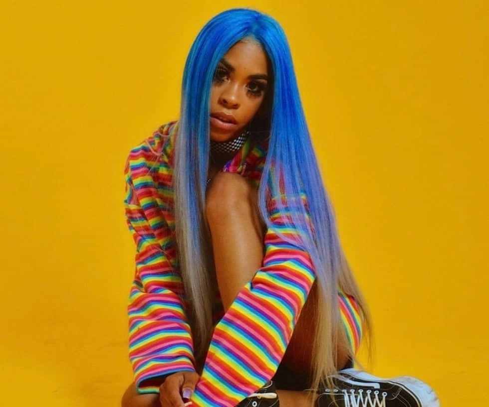 A Woman With Blue Hair Sitting On A Yellow Background Wallpaper