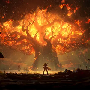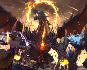 A Surreal Anime World Of Flames And Soaring Creatures Wallpaper -