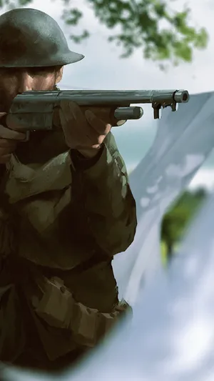 A Soldier Is Shooting A Gun In A Battlefield Wallpaper -