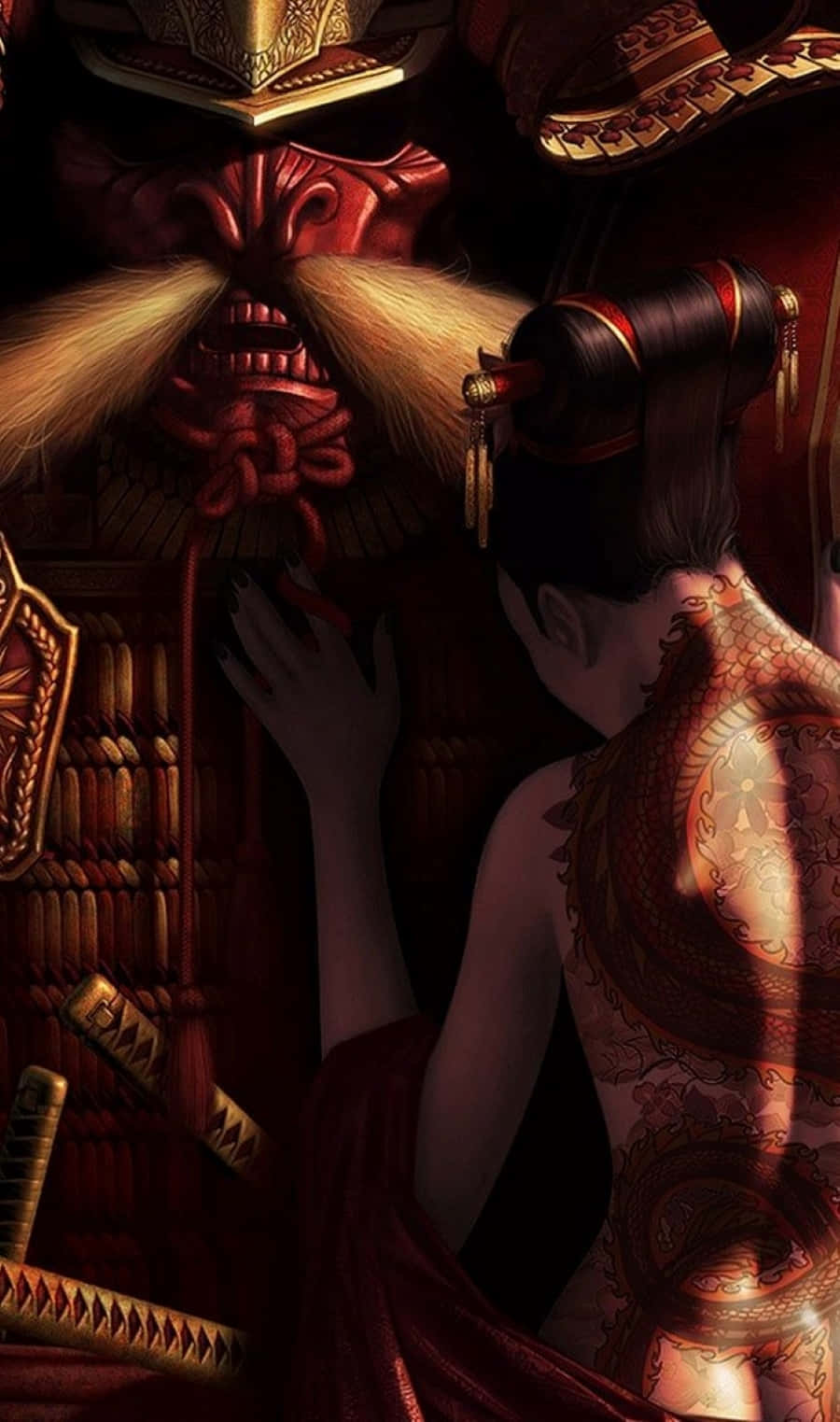 A Stunning Depiction Of A Japanese Shogun With A Fierce Expression And A Striking Background Wallpaper -