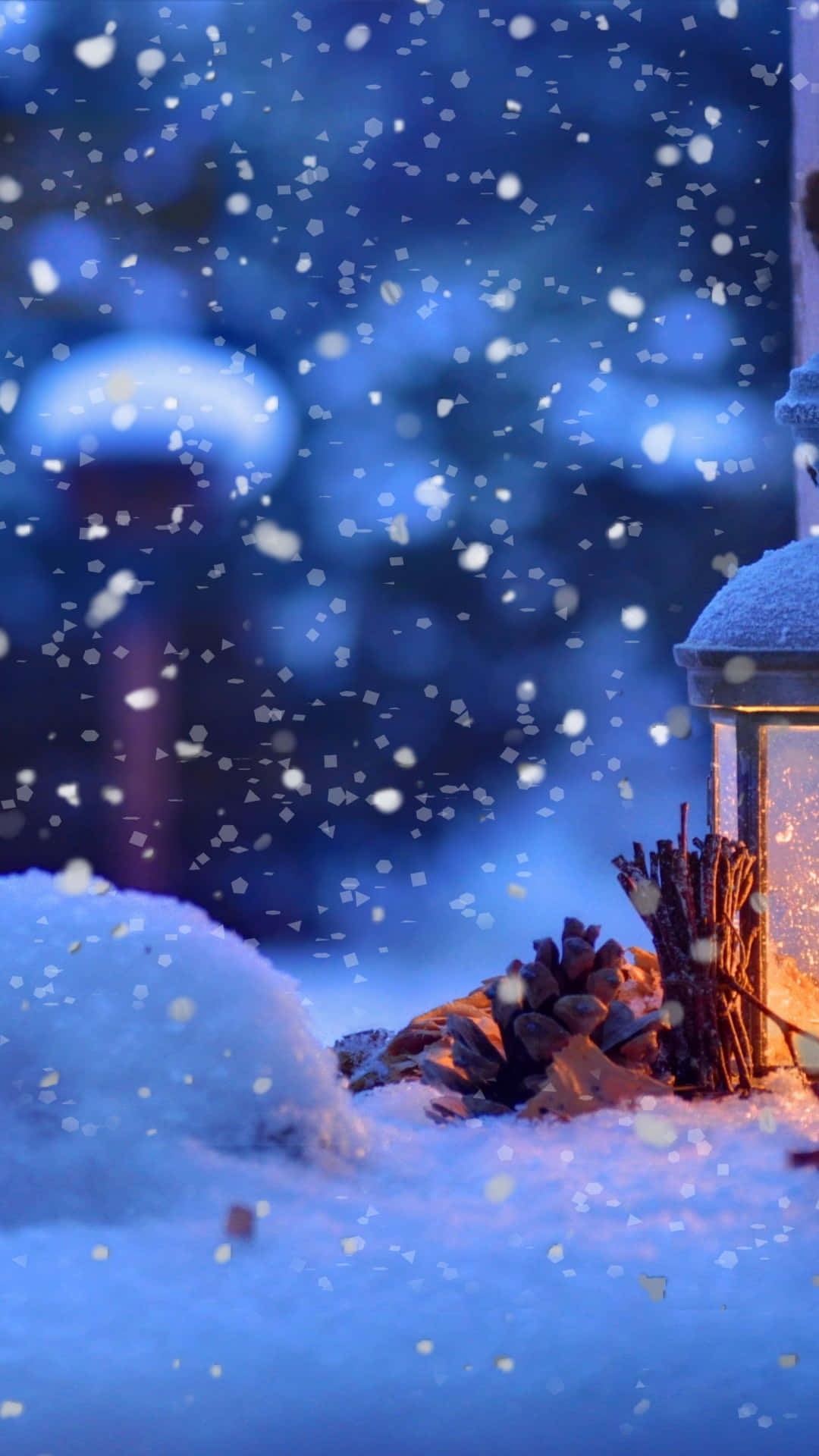 A Lantern Is Sitting On A Snow Covered Window Sill Wallpaper -