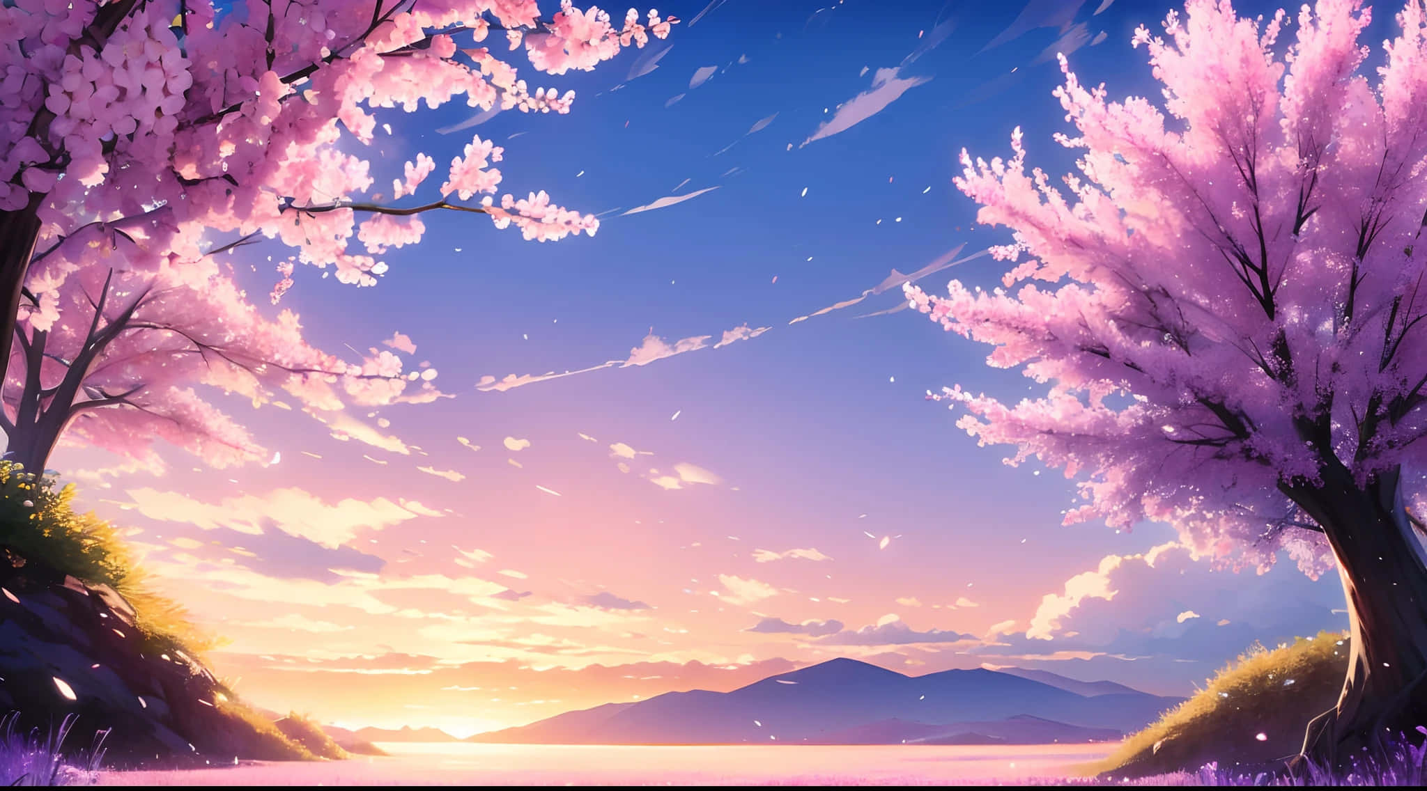 Cherry Blossom Sunset Anime Scenery Wallpaper
