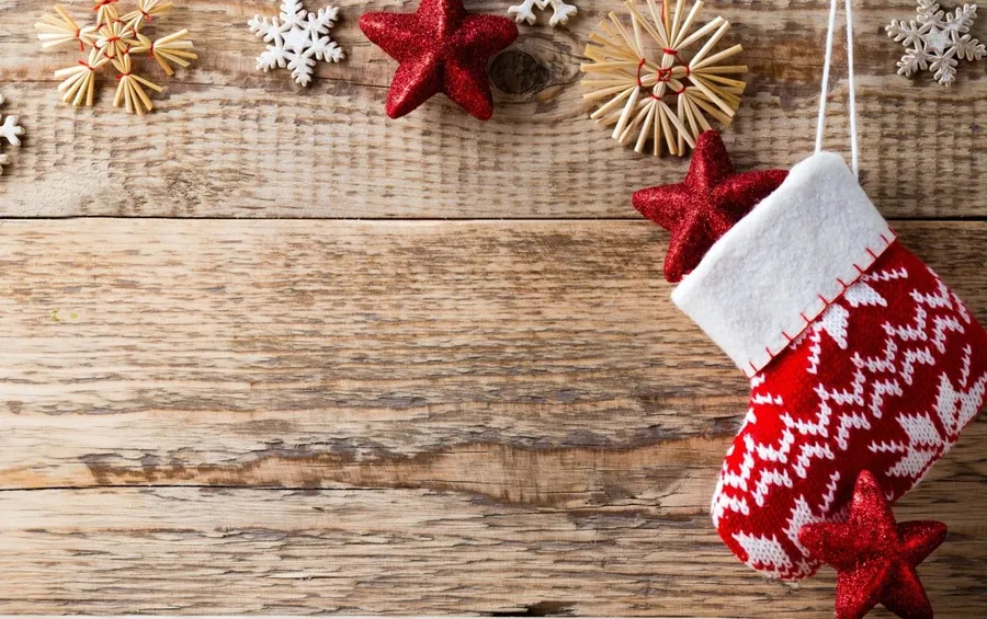 Related Christmas Stocking Hanging On A Wooden Background Wallpaper