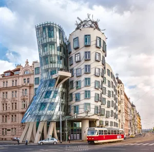 "tram Passing By The Dancing House In Prague" Wallpaper -
