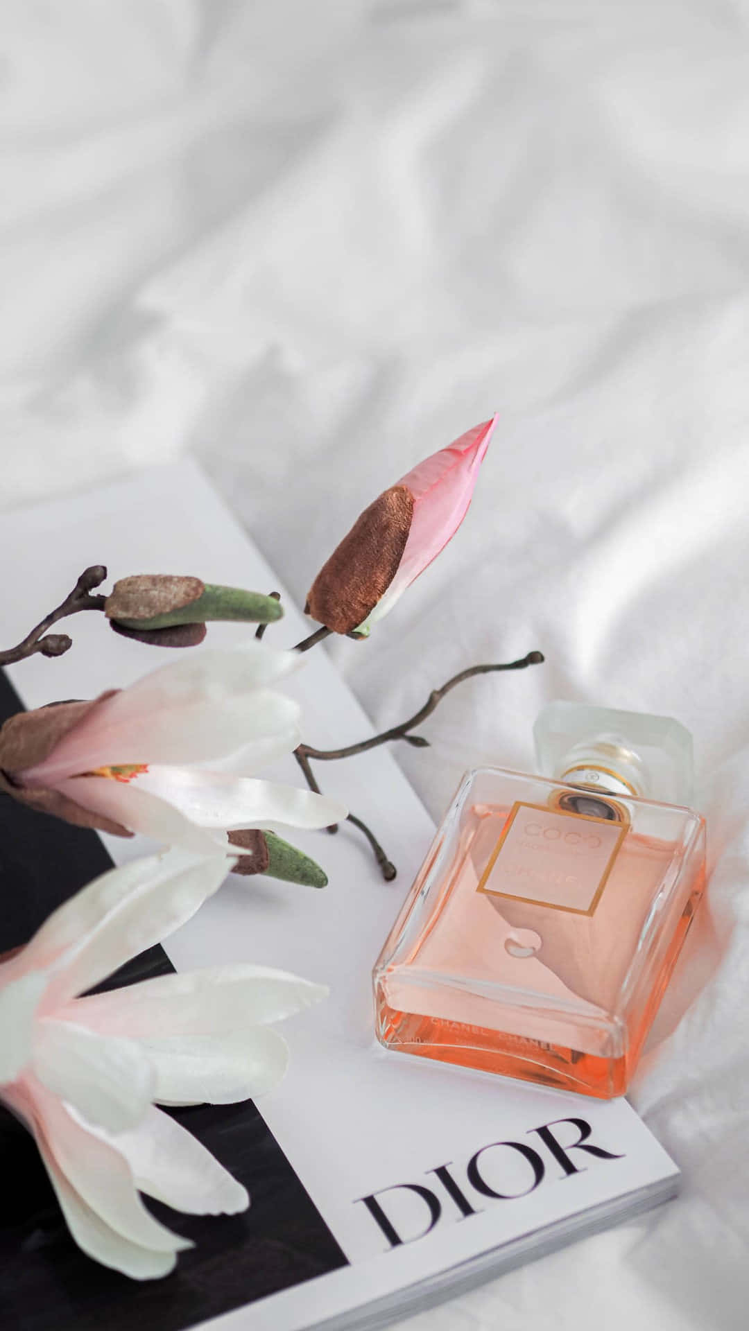 Elegant Dior Perfume Bottle Floral Arrangement Wallpaper
