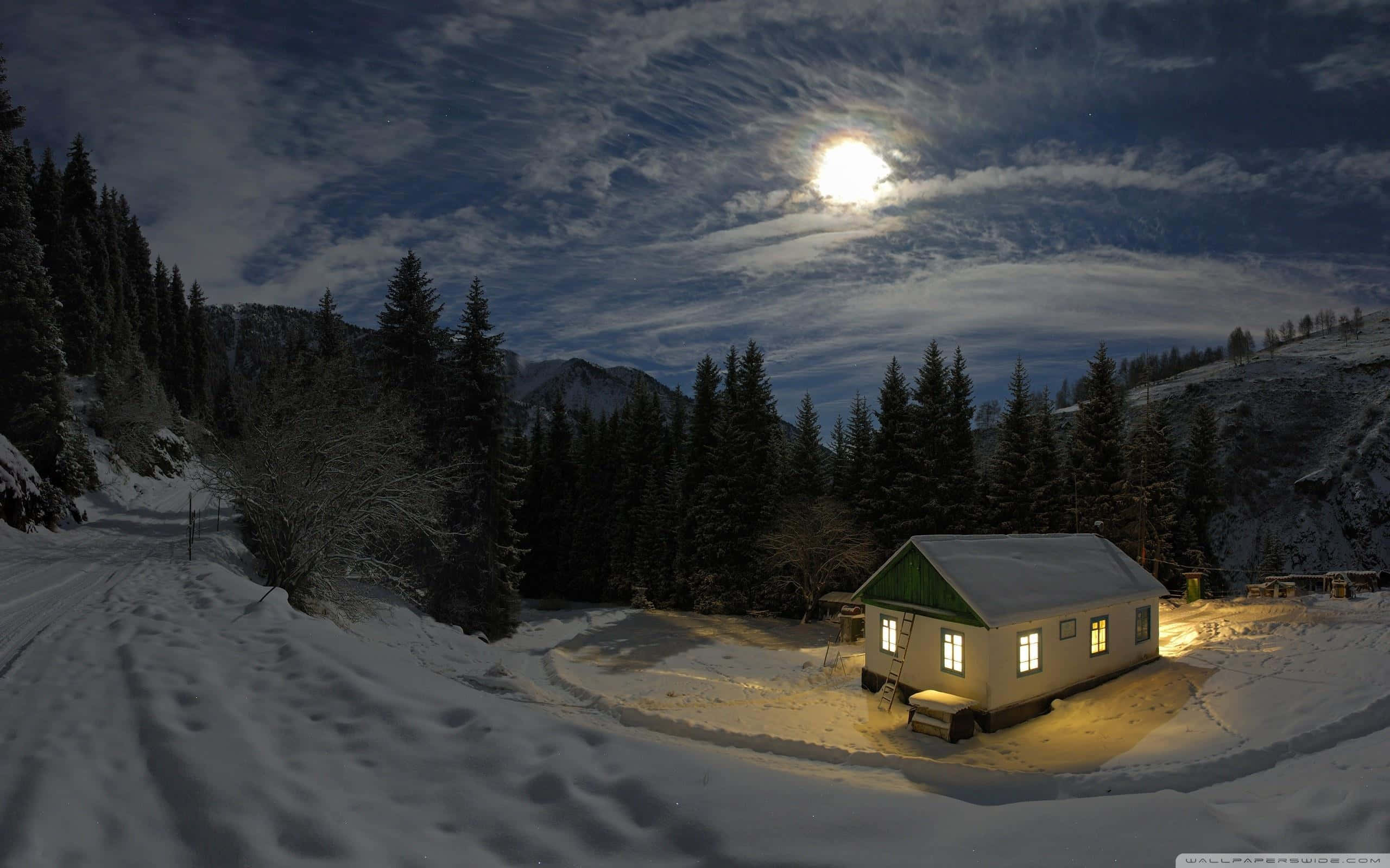 Enjoy A Tranquil Winter Night With A Peaceful Desktop Wallpaper Wallpaper -
