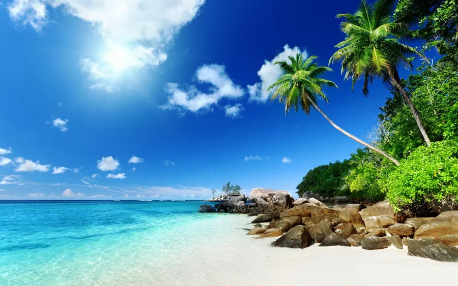A Beach With Palm Trees And A Blue Sky Wallpaper -