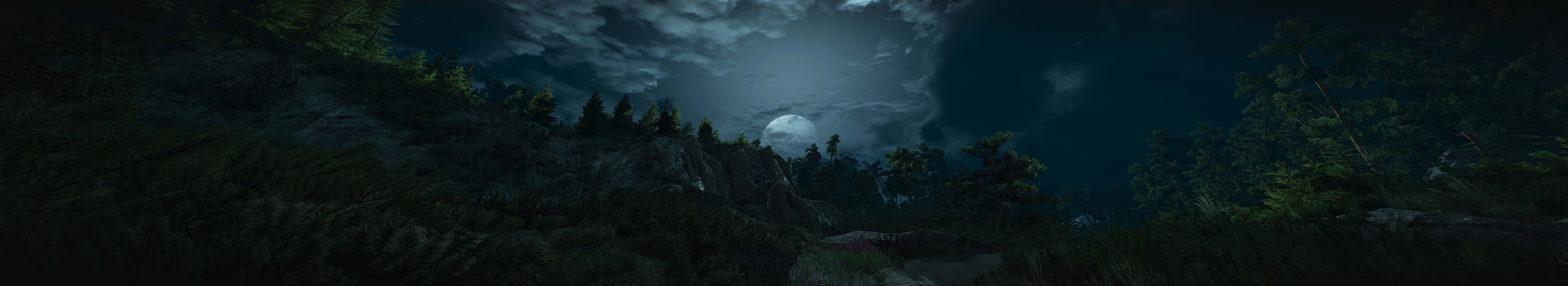 Gloomy Forest With Blue Glow Dark Triple Monitor Wallpaper -
