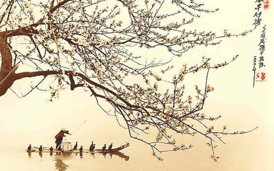 A Traditional Japanese Painting Showing A Colorful Nature Scene Wallpaper -