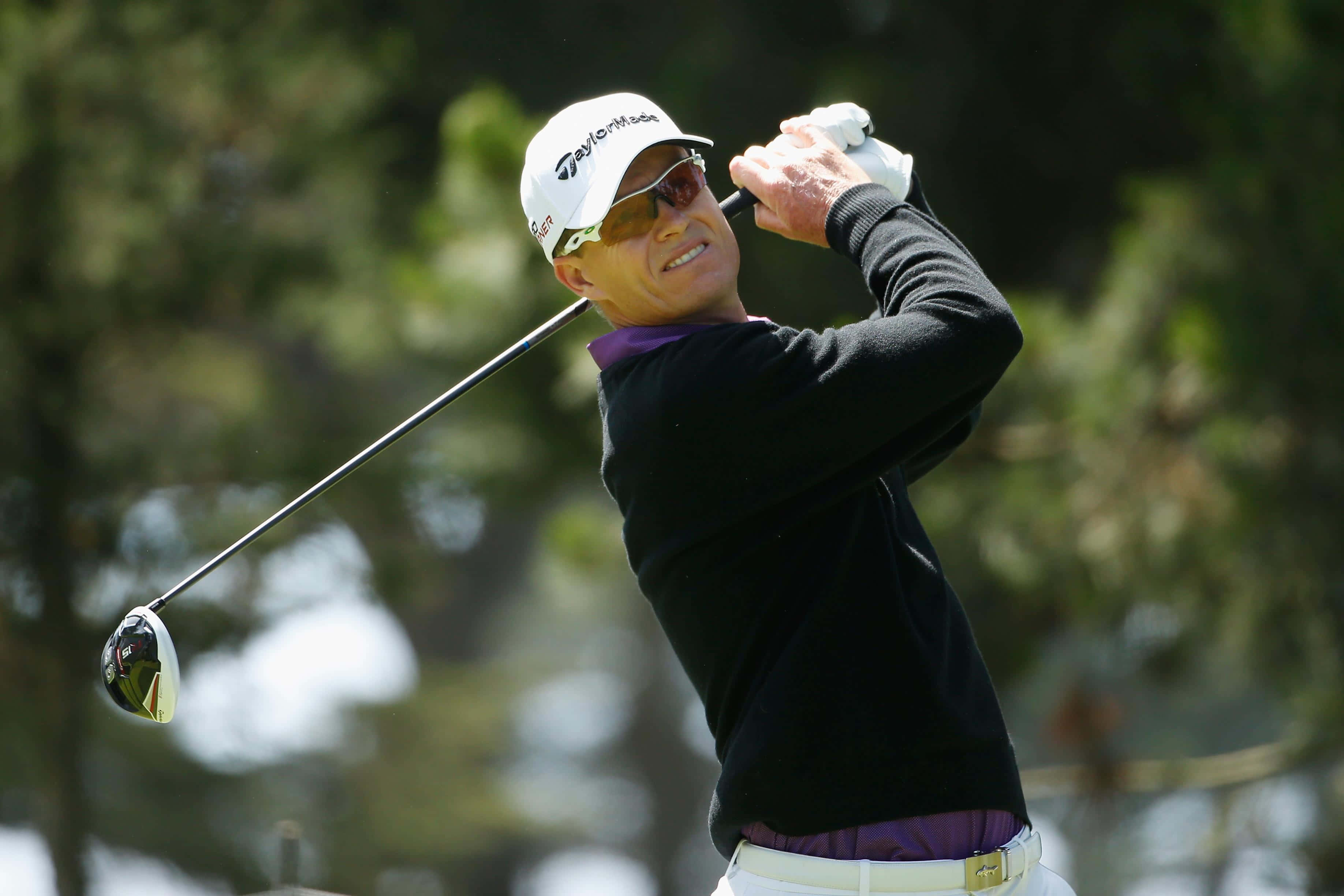 Caption: John Senden Exhibiting Perfect Post-swing Pose At A Golf Event. Wallpaper -