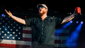 Musician Luke Combs Performing On Stage With A Classic America Flag Background Wallpaper -