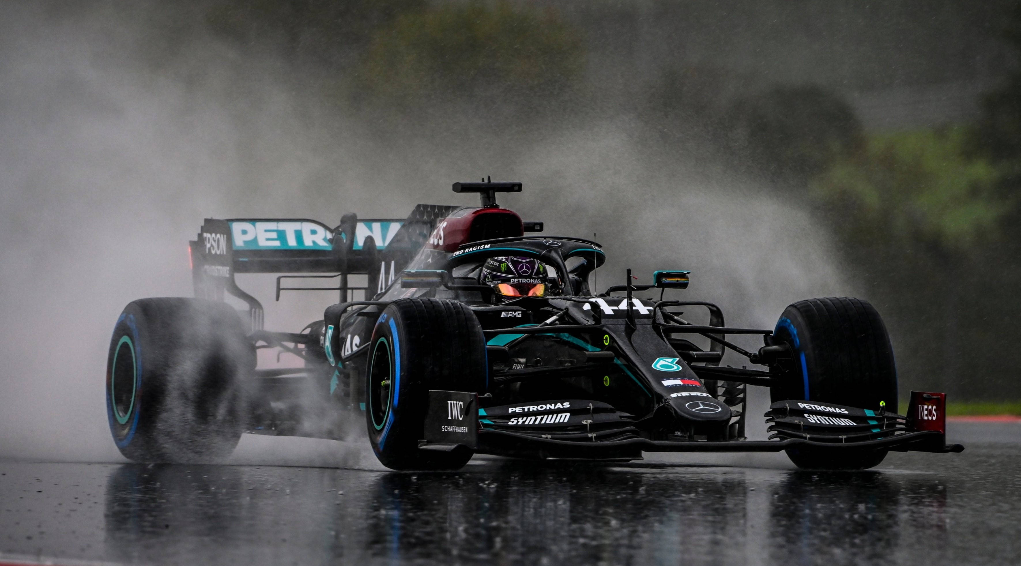 A Mercedes F1 Car Is Driving Down The Track Wallpaper -