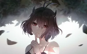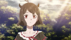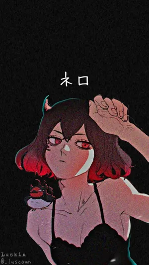 A Girl With Red Eyes And Horns Is Standing In A Tree Wallpaper -