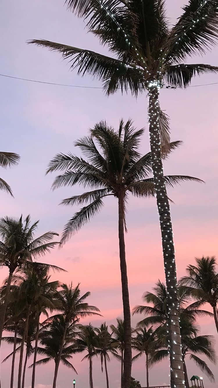 Palm Trees Lit Up At Sunset On The Beach Wallpaper