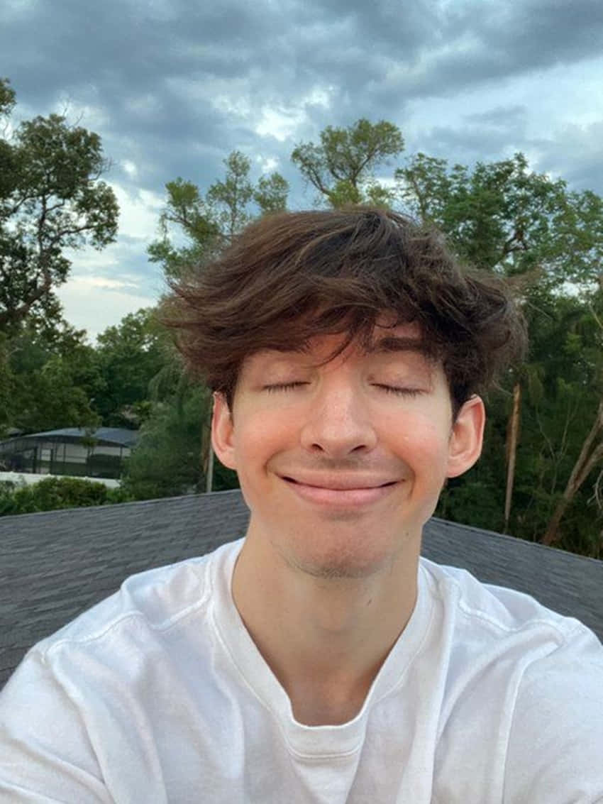 A Young Man Is Smiling While Wearing Headphones Wallpaper -