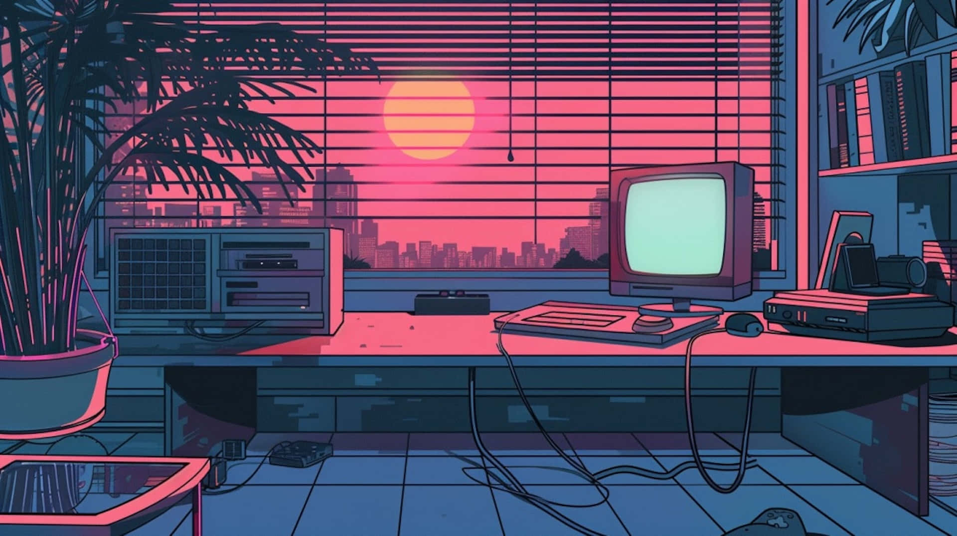 Retro_ Computer_ Room_with_ Pink_ Hues Wallpaper  -