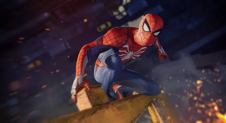 Spider Man Ps4 4k Looking At Fire Sparks Video Game Wallpaper -
