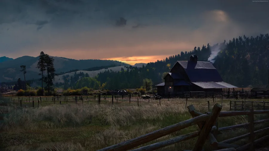 A Country Road With A Farmhouse In The Distance Wallpaper -