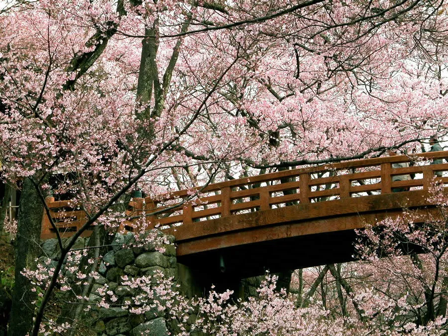 A Walkway With Pink Blossoms And A Bridge Wallpaper -